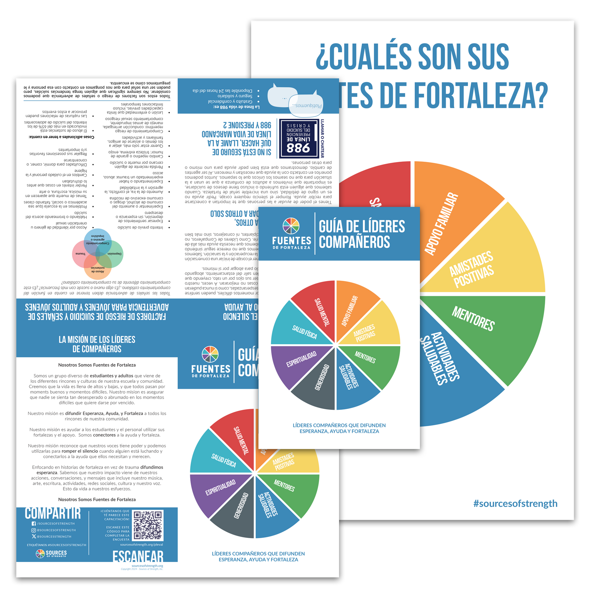 Equip every Peer Leader with the confidence and knowledge to be Agents of Change and Connectors to Help. The Sources of Strength Spanish Peer Leader Guides are an essential, all-in-one resource designed specifically for the Peer Leaders driving Sources of Strength's prevention efforts. The Peer Leader guide puts critical information directly into your team's hands, including the Peer Leader Mission Statement, clear guidance on recognizing suicide risk factors and warning signs, and actionable steps for breaking the silence and connecting others to support. When unfolded, the Peer Leader Guide transforms into a Spanish Sources of Strength Wheel poster! Peer Leader Guides are required for Peer Leader Trainings and recommended to us as an ongoing Peer Leader resource.